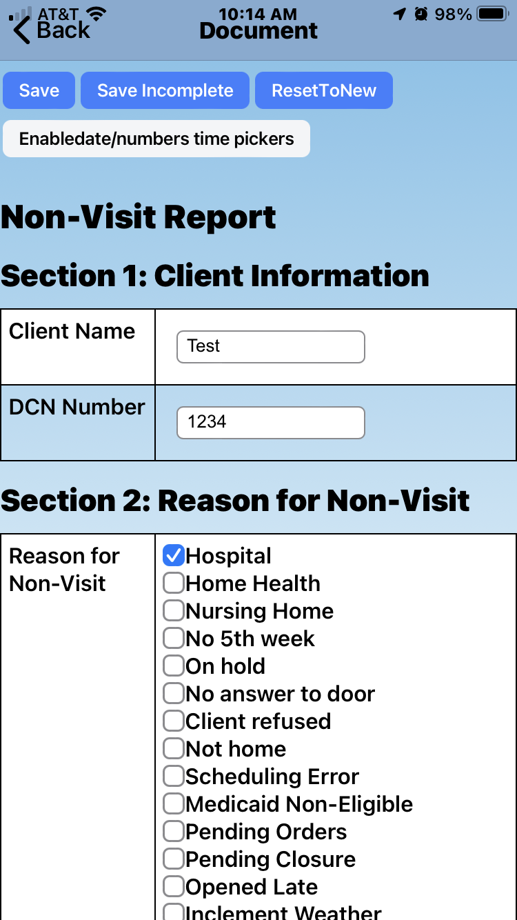 Here you will fill the form. After done scroll back to the top to Save. There is an option to select Save Incomplete, this is used so you can go back when later in the visit to finish the document. ResetToNew button will clear what you have previously entered.