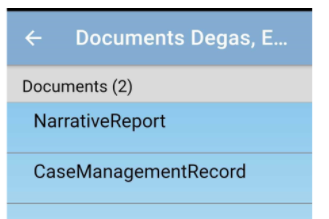 The Documents sections is different from the documents available on a visit for nurses or other caregivers. By clicking on this section, you will have access to PDF versions of saved forms. (This differs from access to forms on visits, where the forms are accessible for editing.) These documents links can be clicked for a quick read-only experience.