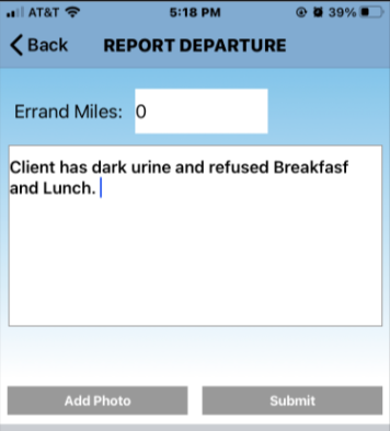 When it is time to report departure, you will be prompted after the signature section to Report any concerns. This is a separate section from regular notes. Here you will report examples such as: refusal of medication, refusal to eat, falls, behavioral changes, etc.
