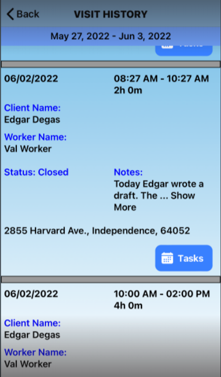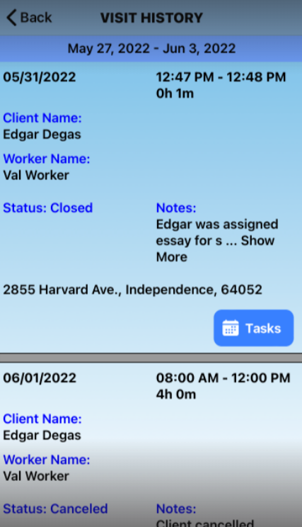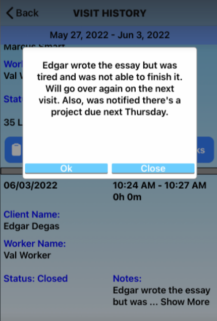 This feature shows a history of notes on each care plan item history notes. Click History to open recent notes from other caregivers. Your office will decide how many days of notes you will see. For example: