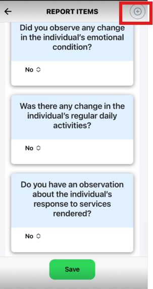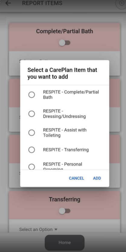 If you are providing Respite services, report any additional care plan items by selecting the plus sign at the top right corner of the tasks page. Add the appropriate Respite care plan item(s) and mark as complete/not needed/refused.