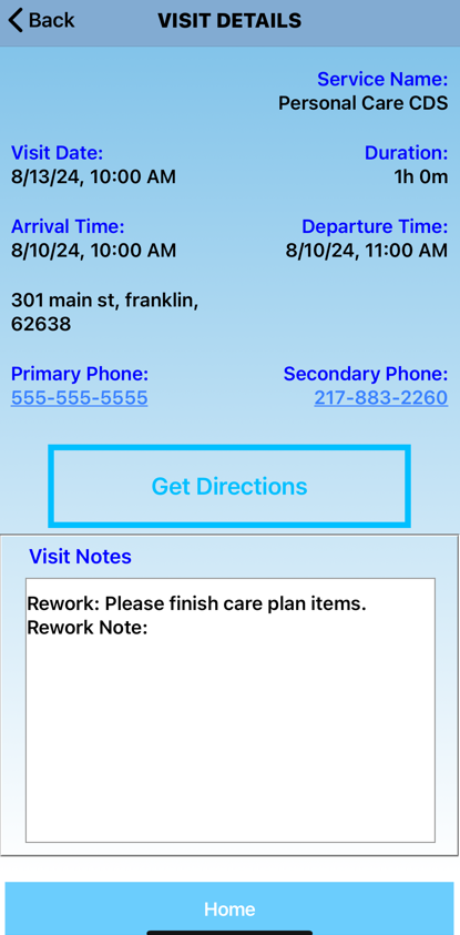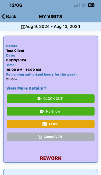 For caregivers who do not schedule their own visits, visits can be sent to in a Rework status in the Visits section, so you can rework your previous visit.
