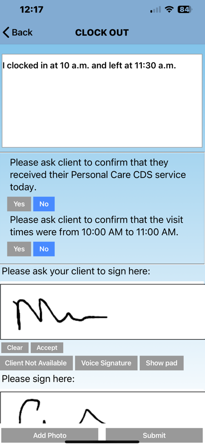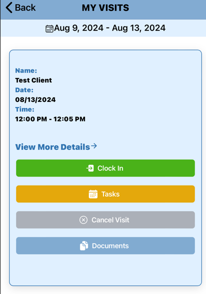 When there is a scheduled visit, there is a button (optional) to select Cancel Visit. When doing so, the app will prompt a notes section and a specific list of reasons such as Client Cancelled, Caregiver Cancelled, Client Hospitalized, etc.