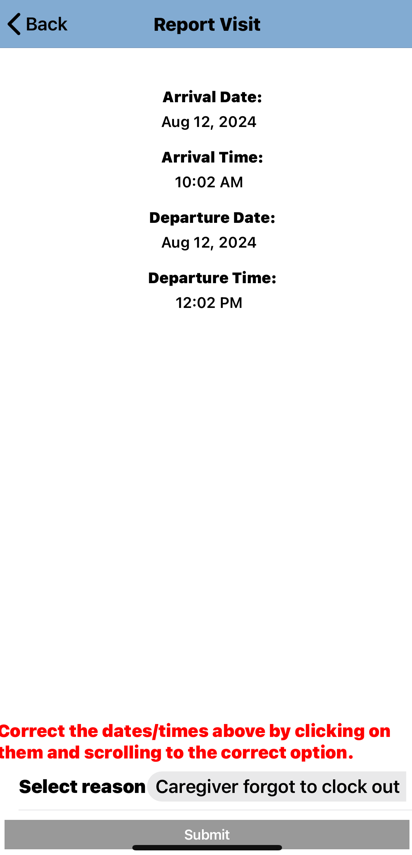 This functionality is under My Visits and will show an older visit below. First the caregiver will select Report Departure where it will go to the Report Visit screen. Here the caregiver can click on the Departure Time and Date and adjust with the scroll below. Be sure to Select a Reason if prompted then hit Submit. If tasks are needed reported it will then prompt to complete care plan items. Then the caregiver will select Okay for departure. This will send the visit to Ankota's Admin side to be reviewed.